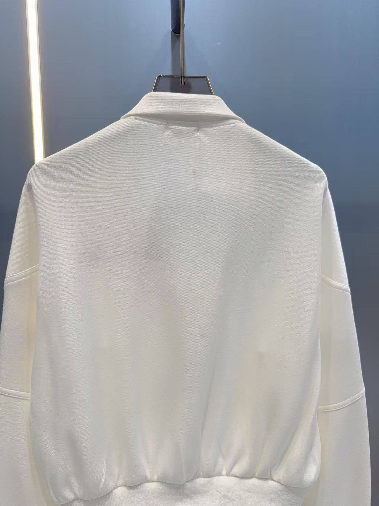 طقم رياضي أبيض من CELINE مكوّن من جاكيت بسوستة وبنطال مريح، بتصميم أنيق وخطوط جانبية سوداء. مثالي لإطلالة كاجوال عصرية تجمع بين الراحة والفخامة.