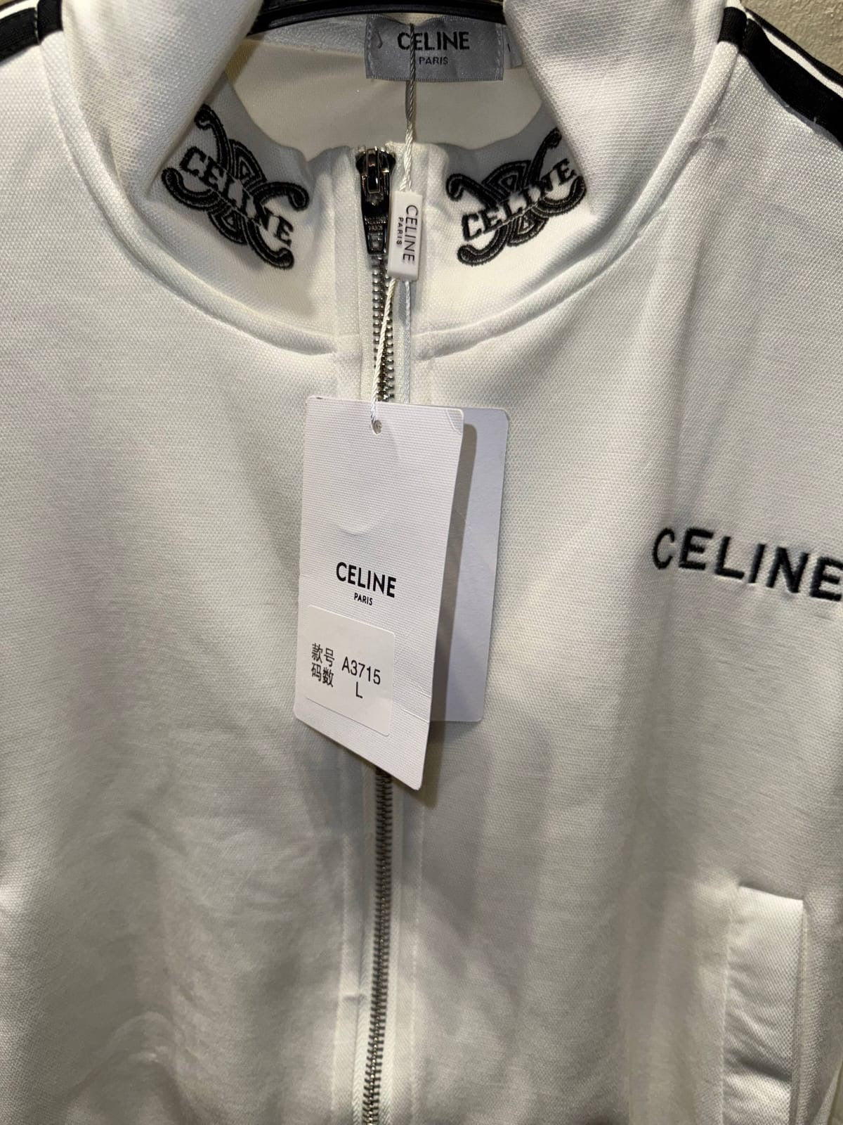 White tracksuit set by CELINE, featuring a zip-up jacket and comfortable pants with black side stripes. A sleek, modern design perfect for casual and stylish everyday wear.