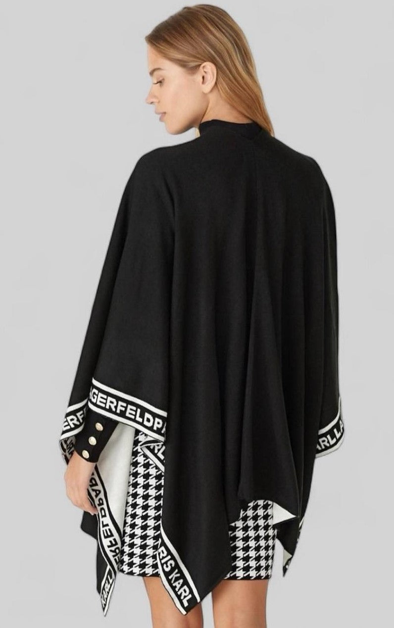 A chic black and white Shawl featuring the iconic Karl Lagerfeld logo along the edges. The design combines elegance with casual style, perfect for layering over a simple outfit.